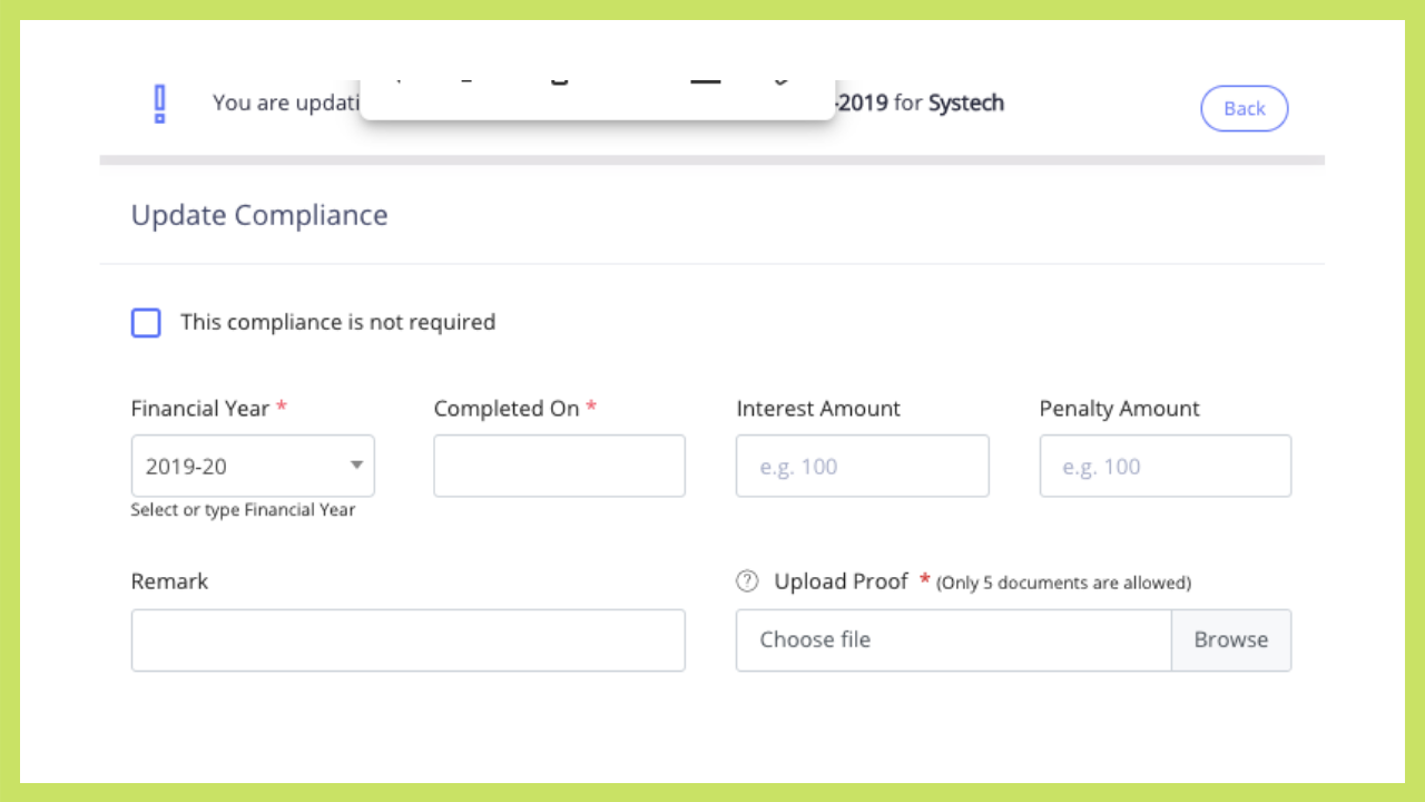 - Update Compliances with completion details and upload proof documents wherever necessary