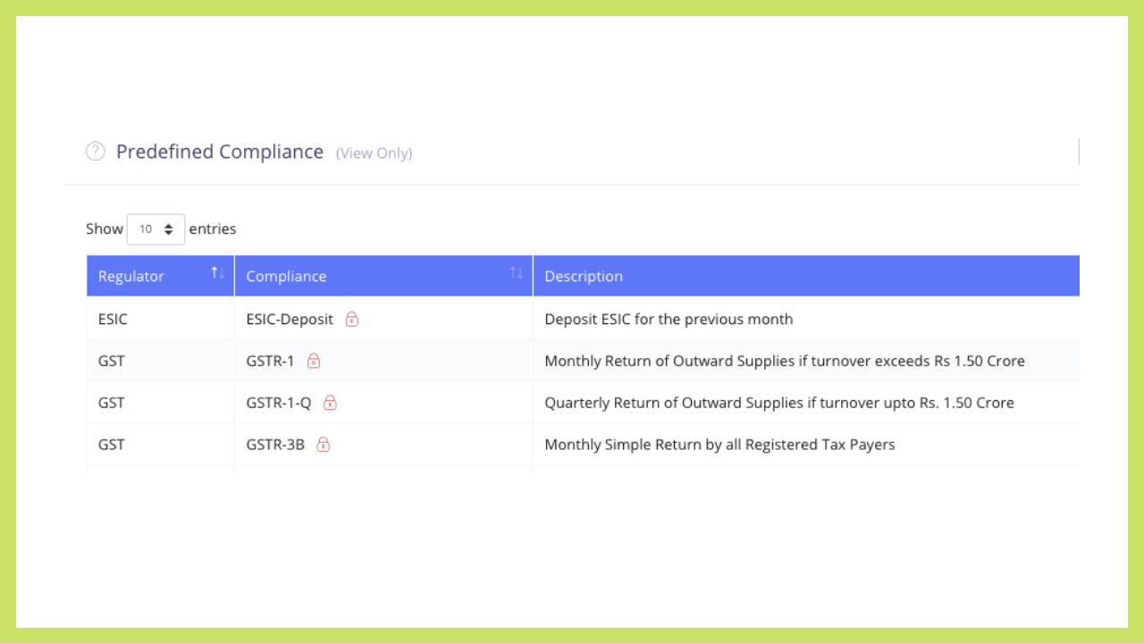 - We have already added most common compliances pertaining to Income-tax, GST, Companies Act, LLP, Profession Tax, PF and ESIC. View them once, so that you do not end up adding them again