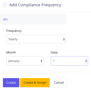 - Create & Assign : in this case, you will be presented with Compliance Period and Entity dropdown. You can assign this compliance to one/many entities.